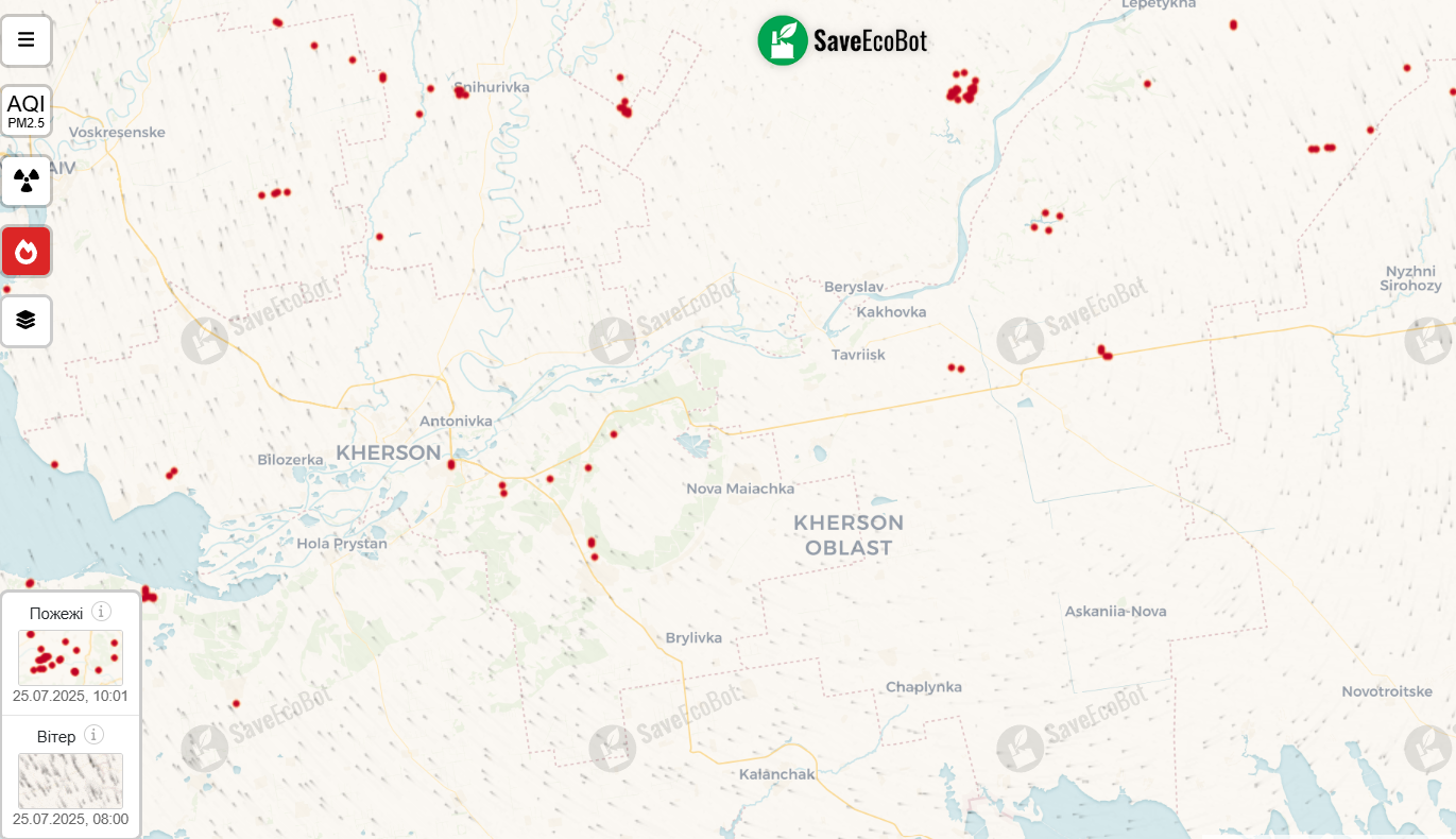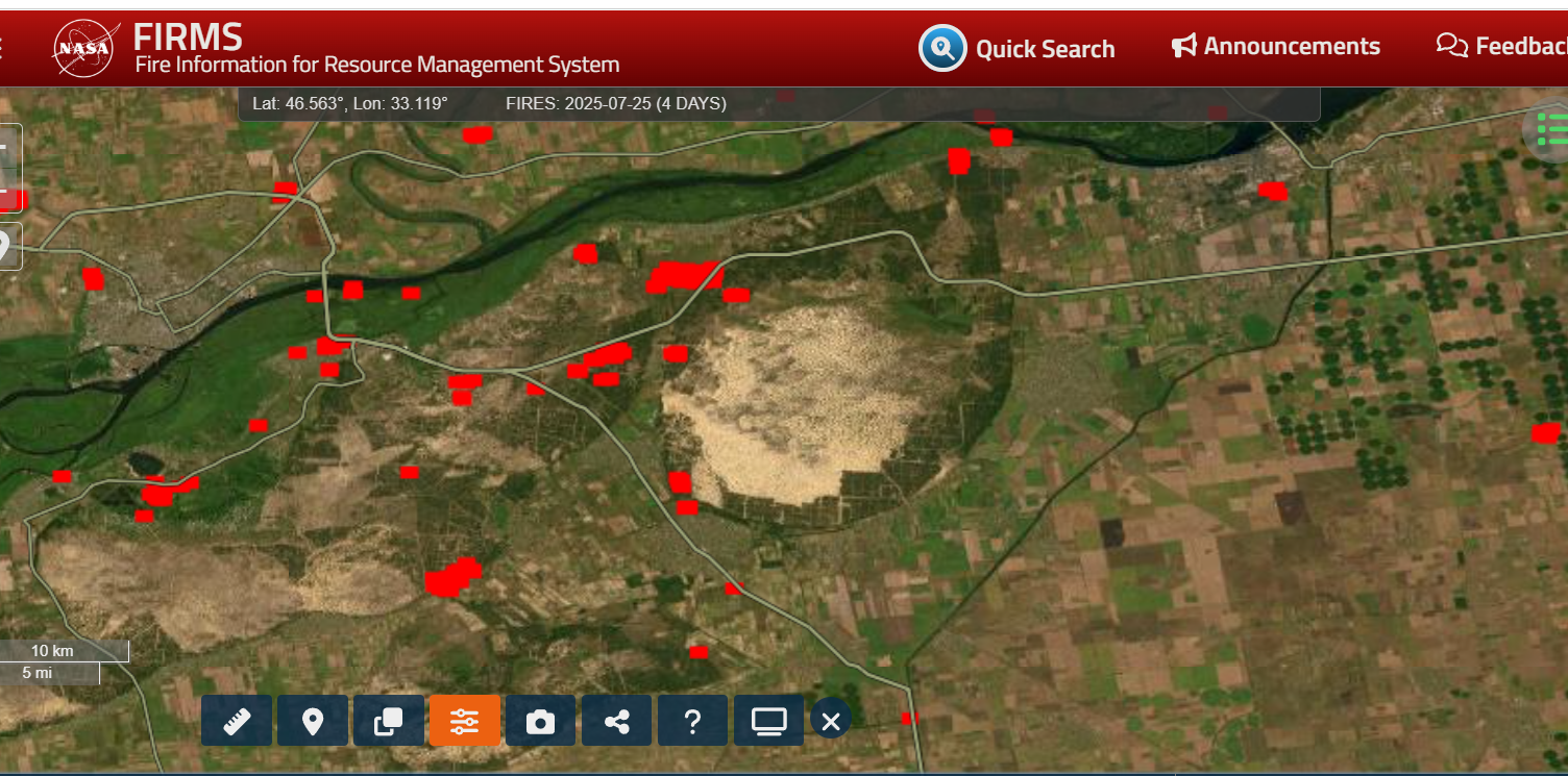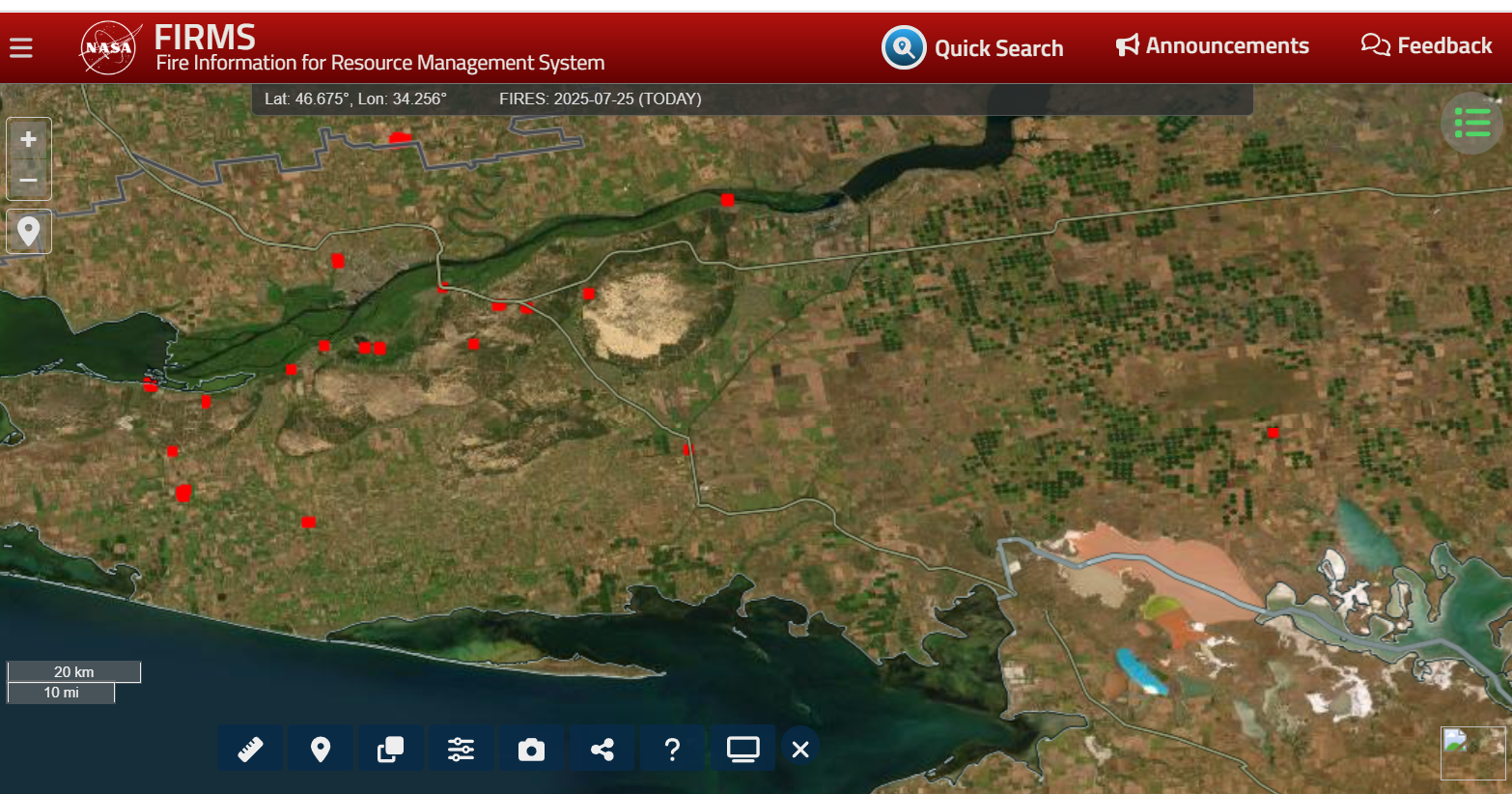 Карта пожеж 25 липня 2025 року. NASA | LANCE - FIRMS