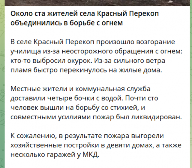 Рятувальні служби так і не доїхали до місця пожежі — трохи згодом доїхали лише місцеві окупаційні комунальні служби. Росіяни вже не надто приховують нестачі працівників в окупації, особливо в комунальній, рятувальній, медичній та освітній сферах. Відтак, регулярно «висловлюють вдячність» місцевим жителям, які змушені самотужки боротись із усіма проблемами.