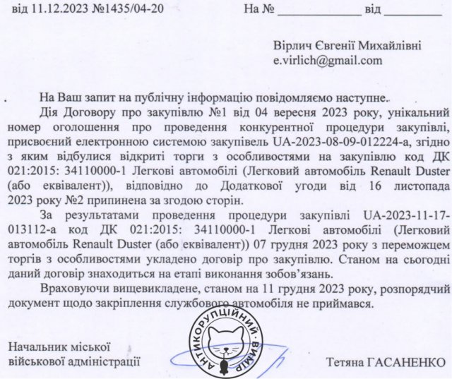 Журналісти поцікавились, за ким це авто буде закріплене – і виявилось, що станом на 11 грудня 2023 року жодного розпорядчого документа про закріплення за кимось нового авто немає.