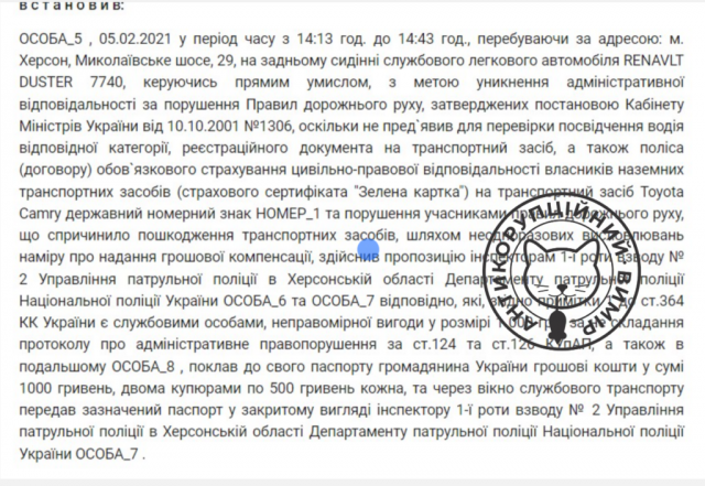 Щодо Олега Булигіна справу також розглядав Херсонський міський суд і покарання – те саме: 17 тисяч гривень штрафу. Відповідно до даних вироку суду, перебуваючи в відділенні поліції в смт Білозерка цей пан запропонував гроші за вирішення питання щодо повернення свого автомобіля заступнику начальника СРПП Генічеського РВП ГУНП в Херсонській області, майору поліції. За даними ухвали, Олег Булигін надав шляхом поміщення під блокнот на стіл перед майором поліції грошові кошти у розмірі 5000 гривень за незаконне вирішення питання щодо повернення свого автомобіля ВАЗ 212140. Цей автомобіль у пана Булигіна був вилучений 28.08.2023 під час складання протоколу про адміністративне правопорушення (нетверезе водіння).