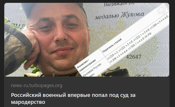 “За даними суду, обвинуваченого Качлавова Руслана Львовича, звинувачують за відразу кількома статтями. Крім статті 356.1, частини 4, пункту «б» – мародерство в особливо великому розмірі, Качлавову також пред’явлені звинувачення у незаконному придбанні та перевезенні зброї та вибухівки, незаконному придбанні наркотиків у великому розмірі та перевищення посадових повноважень із застосуванням насильства та зброї”, – зазначають росіяни.