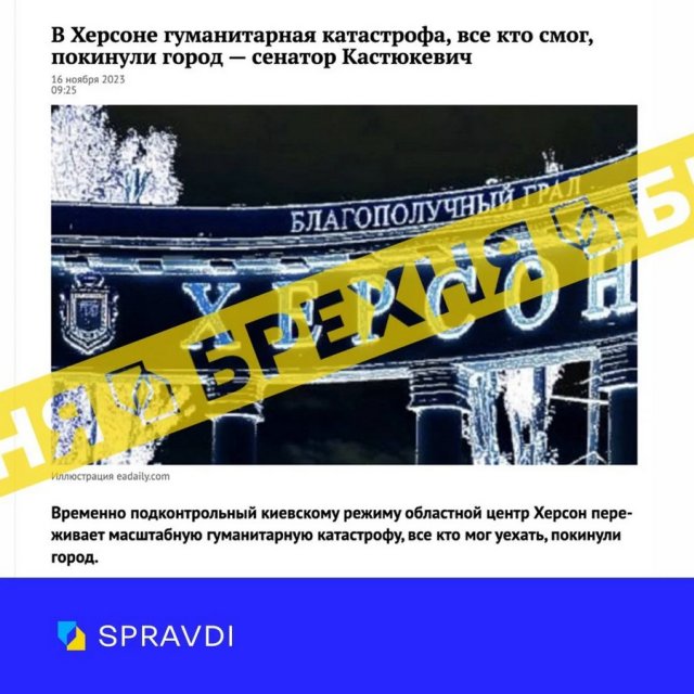 Брехня: з вини України» у Херсоні – масовий голод, населення страждає від перебоїв із водою, електрикою, опаленням, пишуть російські ЗМІ з посиланням на «члена ради федерації росії від Херсонської області» кастюкевича.Про це повідомляє Центр стратегічних комунікацій.