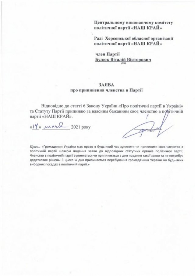 Втім, відкликання депутата вже нічого не змінило. На одній із сесій Херсонської обласної ради Булюка позбавили права слова. Примітно, що Віталій Булюк про припинення членства в партії подав заяву ще у 2021 році – вона також є на сайті партії. Втім, депутатом лишався: членство в партії не є обов’язковим для депутатства.