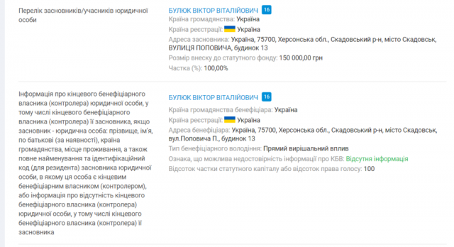 Засновником і кінцевим бенефіціаром фірми є Віктор Булюк – син Віталія Булюка, держзрадника, який нині в окупованій Херсонщині є заступником «губернатора» Володимира Сальдо.