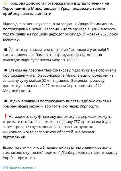 Головна умова оформлення виплати – особи, які претендують на допомогу, повинні були проживати у населених пунктах Миколаївської та Херсонської областей, які зазнали підтоплення до підриву греблі Каховської ГЕС 6 червня 2023 року.