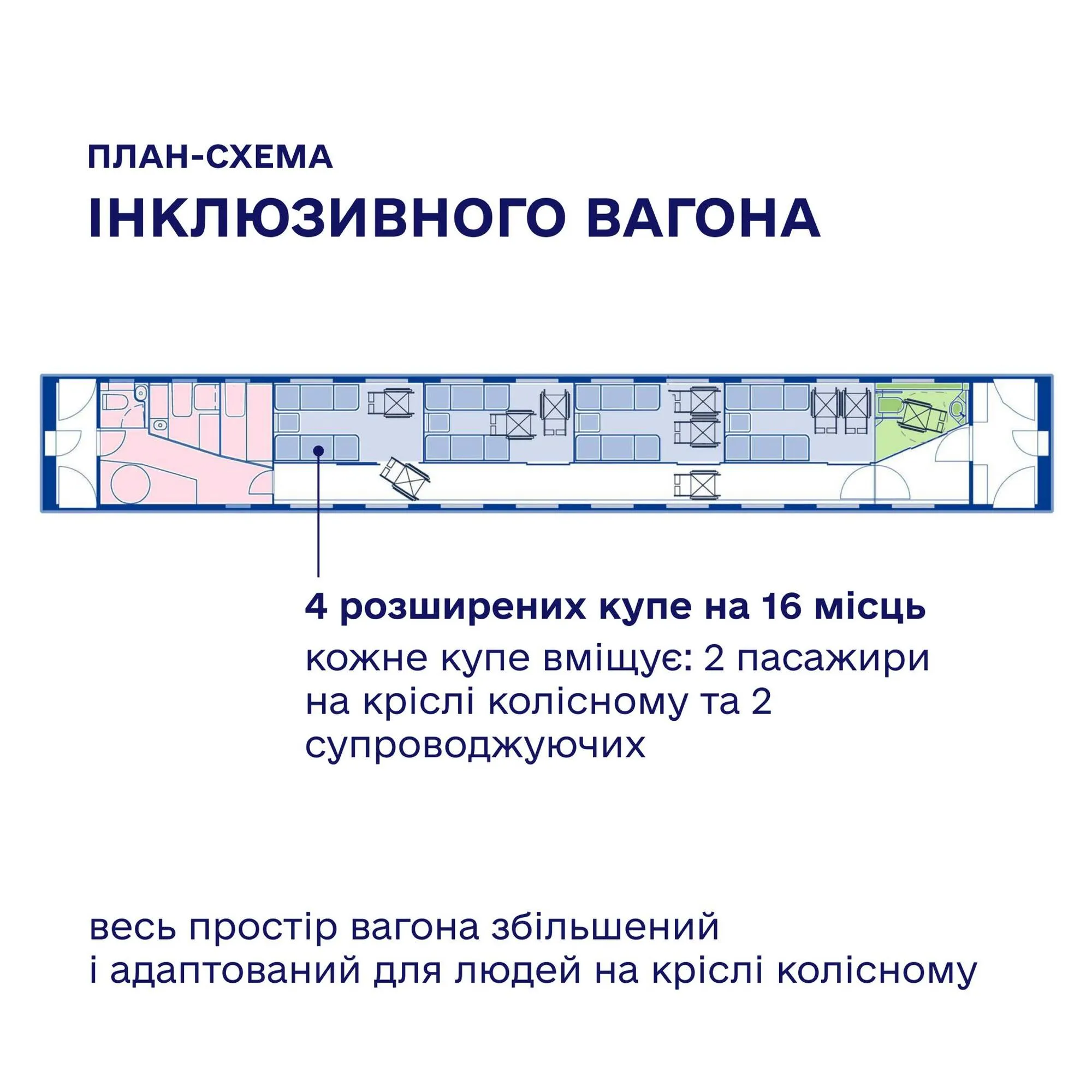 "Укрзалізниця" системно поповнює парк пасажирськими вагонами, які мають купе для перевезення людей на кріслах колісних та інші зручності для комфортної подорожі. Наразі ми маємо вже 50 таких вагонів. А сьогодні презентуємо новий проєкт – унікальний вагон, який дозволить перевозити групи людей на кріслах колісних на реабілітацію, відпочинок, змагання або просто подорожувати. Повністю його обладнаємо на власних потужностях компанії. Перший такий вагон плануємо випустити наступного року", – йдеться у повідомленні.