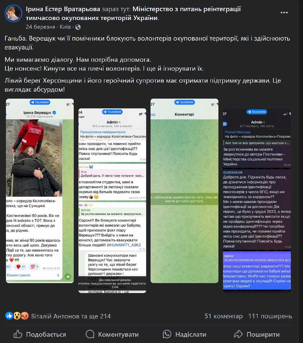 У пості комунікаторки та речниці Humanіty Ірини Естер Вратарьової та в коментарях до нього можна побачити, як адміністратори чату блокують волонтерів