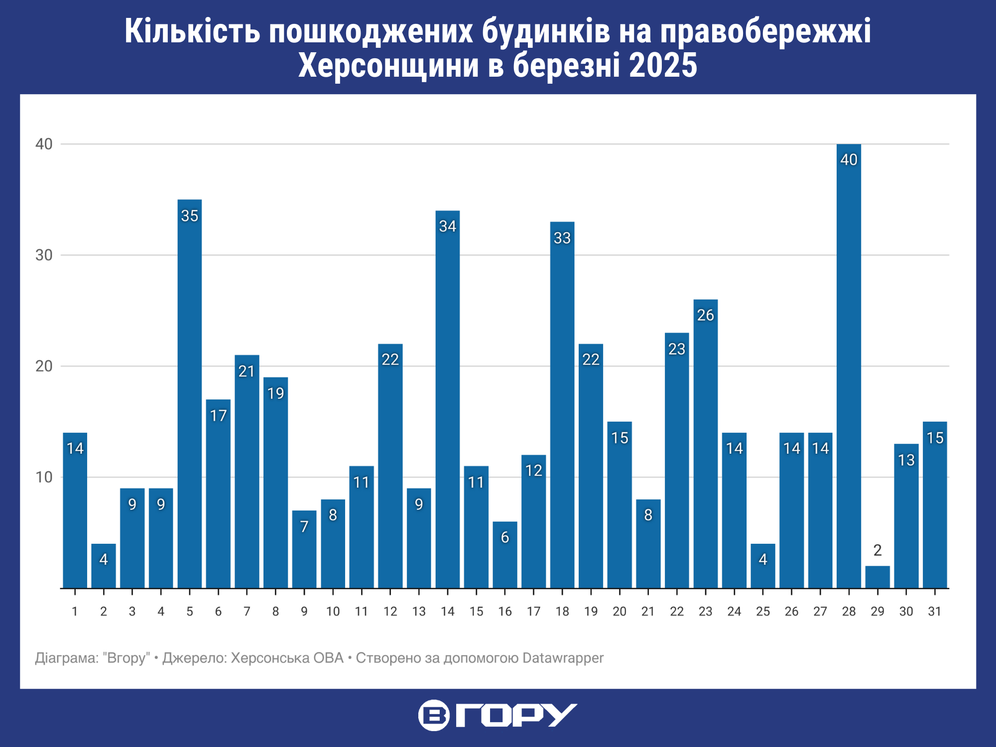 “Вгору” публікує інфографіку про російські обстріли Херсонщини у березні за даними Херсонської ОВА.