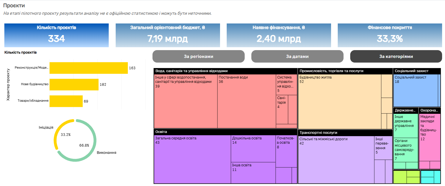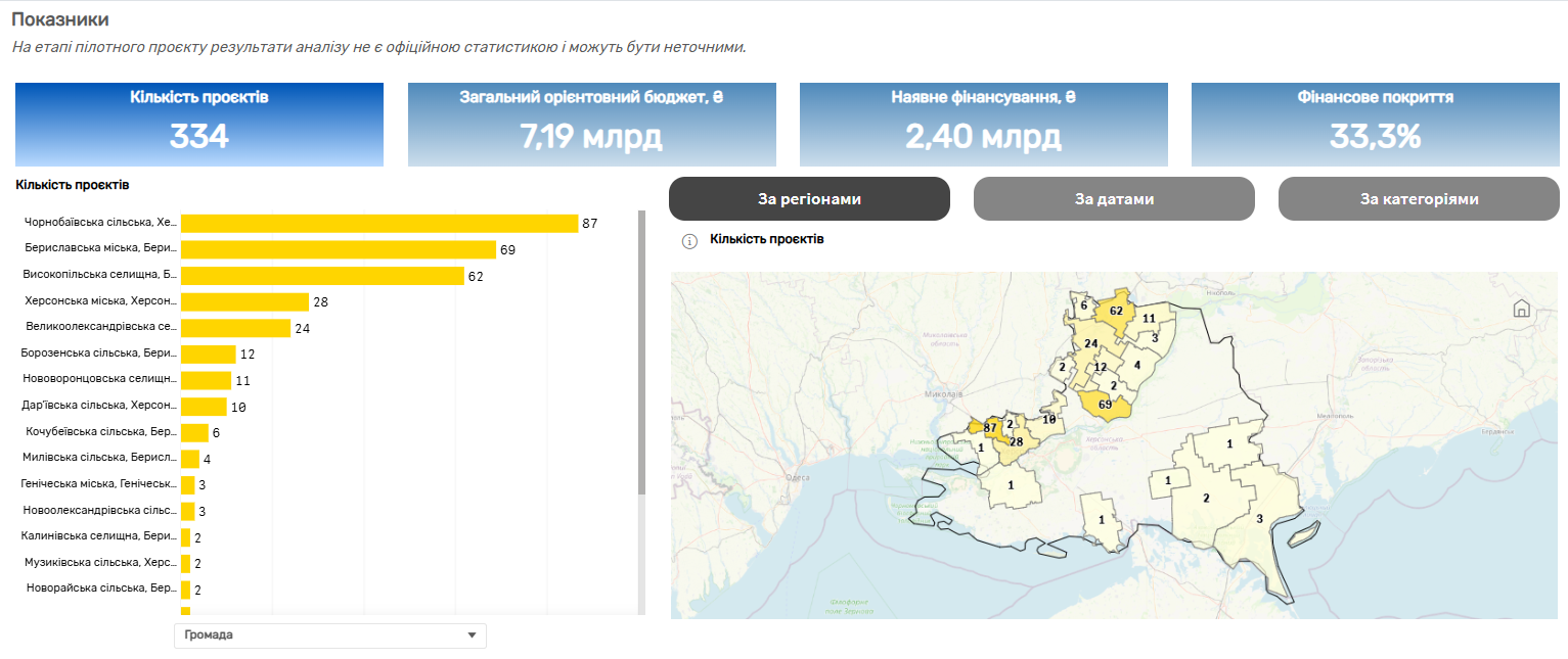 Своєю чергою, Бериславська громада налічує 69 проєктів, Високопільська — 62, Херсонська — 28, а Великоолександрівська — 24.За категоріями відновлення, проєкти розподіляються на ремонт чи модернізацію (163 проєкта), нове будівництво (102) та постачання товарів чи обладнання (69).