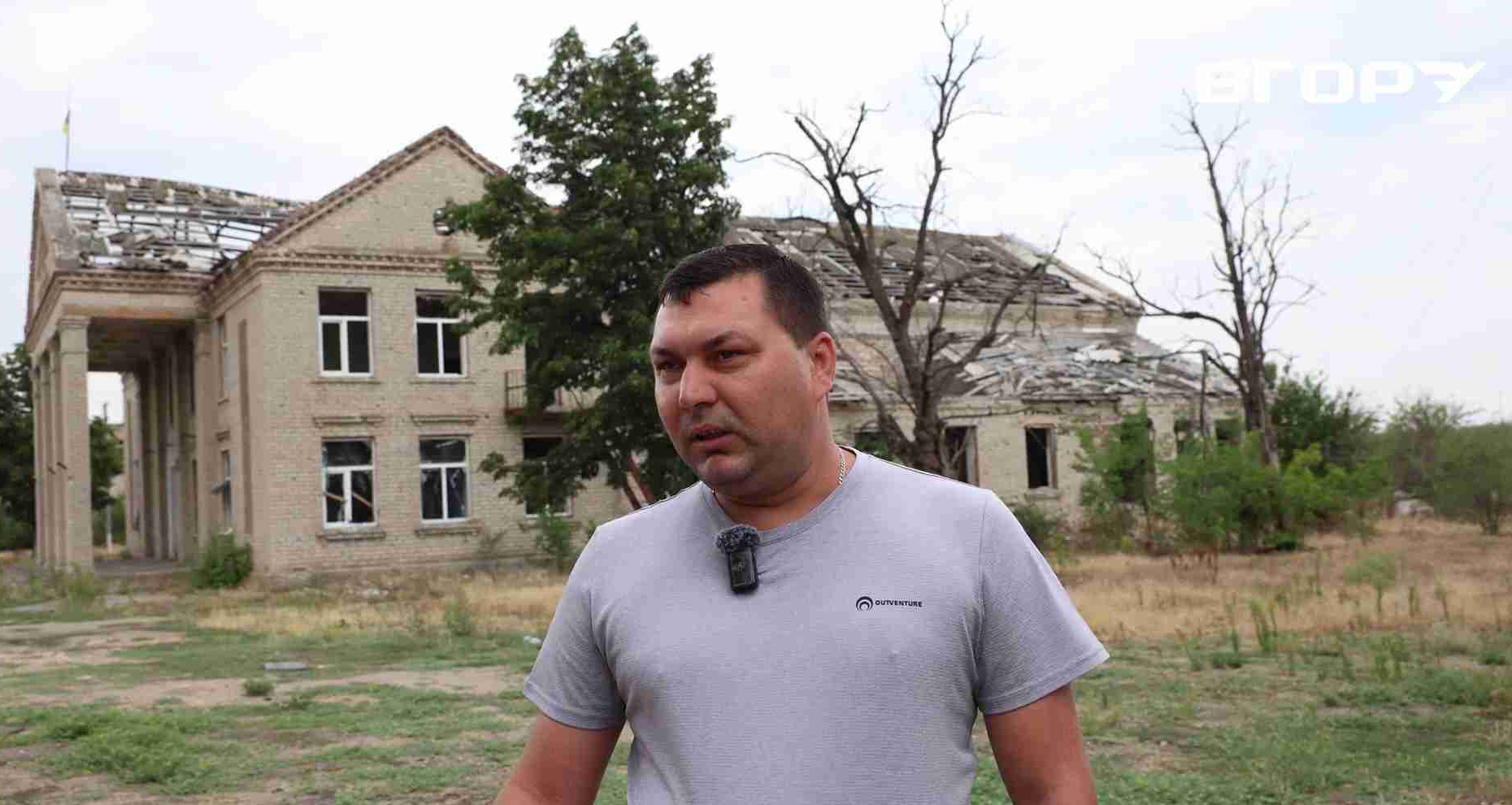 Староста Віктор Сокиряк біля напівзруйнованого Будинку культури. Кадр з відео Олександра Андрющенка/"Вгору"