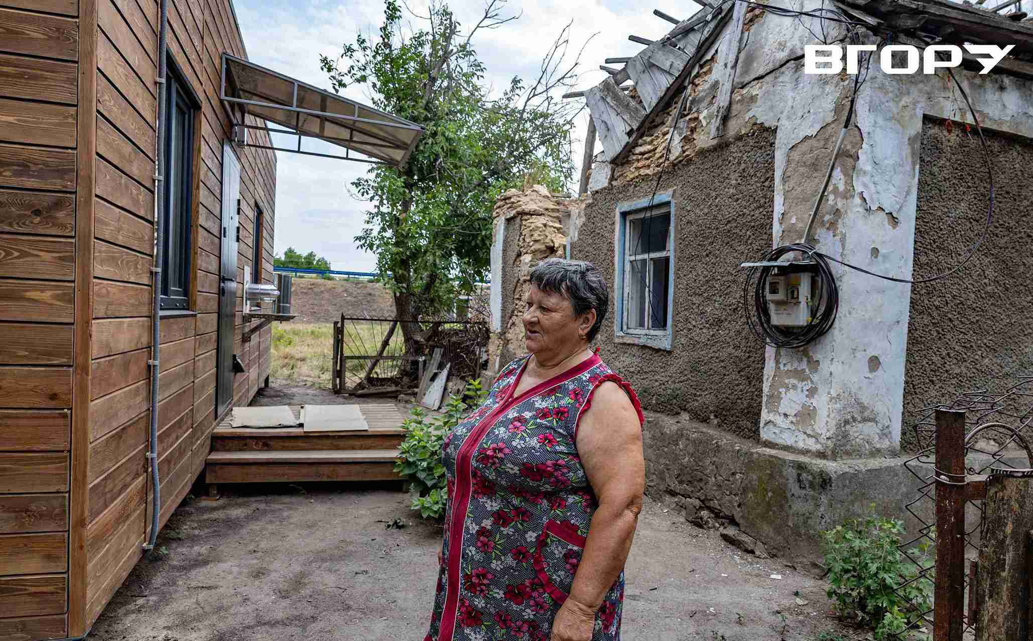 Наталія Іванівна, її зруйноване житло і встановлений поряд модульний будиночок. Фото Олександра Андрющенка/”Вгору”