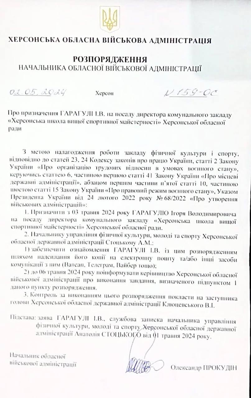 На початку травня розпорядженням голови ХОВА Олександра Прокудіна директором комунального закладу «Херсонська школа вищої спортивної майстерності» Херсонської обласної ради призначений підприємець, волонтер, президент Федерації академічного веслування Херсонської області Ігор Гарагуля.