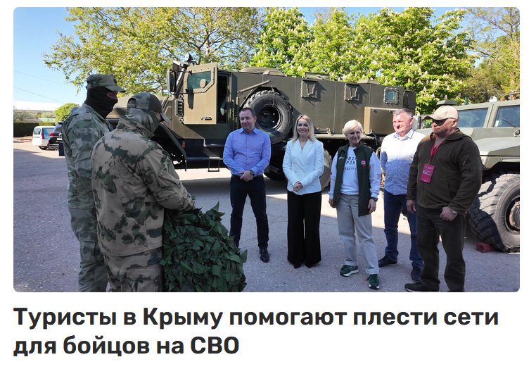 “Один із кримських санаторіїв організував майданчик для плетіння маскувальних сіток, до якого могли приєднатися всі охочі. За минулий заїзд була сплетена перша сітка, яку колектив санаторію разом передав бійцям на Херсонський напрямок”, – повідомляють росіяни.