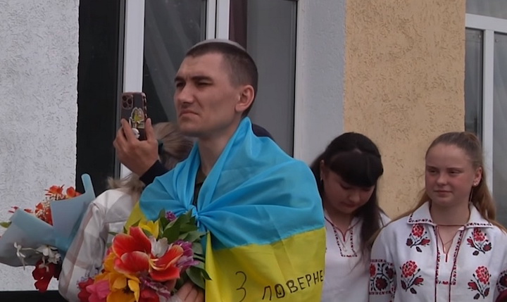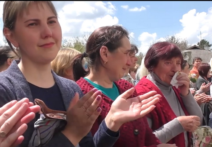 Мешканці Клембівки Вінницької області зустрічають свого земляка Юрія Армаша, звільненого з російського полону, 5 травня 2023 року. Скріншот відео Ямпільської ТРК