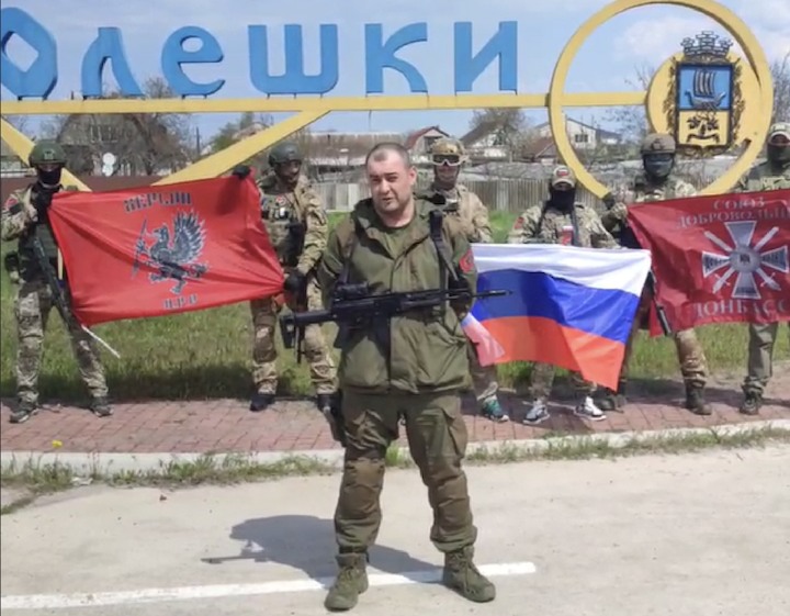 Російські окупанти в Олешках, квітень 2023 року. Скріншот відео: окупаційні пабліки