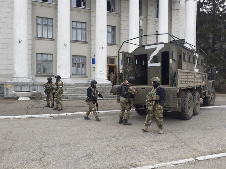 Російські військові біля будівлі Новокаховської міської ради, березень 2022 року. Фото: Олександр Гунько/novakahovka.city
