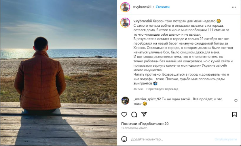 Причини, чому так вирішив, чоловік оприлюднив на своїй тодішній сторінці в Інстаграм – начебто через побоювання вуличних боїв за звільнення Херсона та звинувачення у зраді Україні.