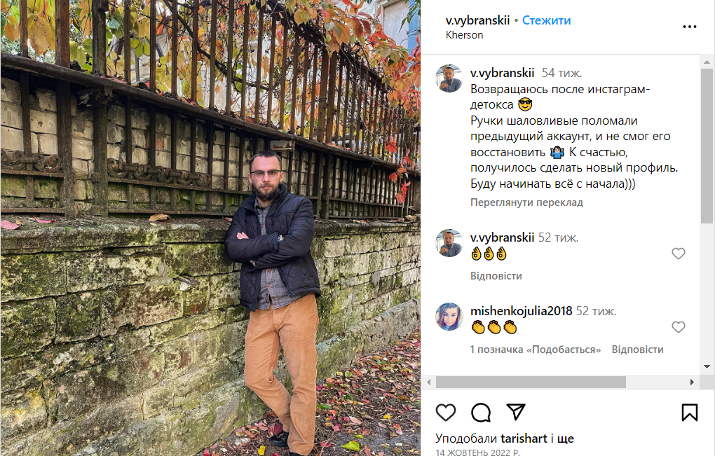 Та й сторінка в Інстаграм, як виявилося, уже інша – попередню, за словами самого Вибранського, хтось зламав перед його втечею з Херсона.