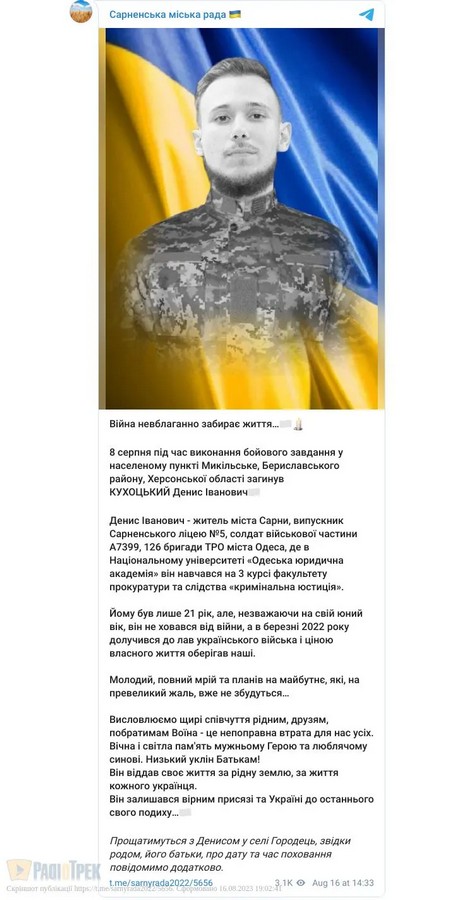 На війні загинув 21-річний Денис Кухоцький із міста Сарни. Це сталося на Херсонщині, повідомили у Telegram Сарненської міської ради.Денис Кухоцький — житель Сарн. Навчався у ліцеї №5. Він був солдатом військової частини А7399, 126 бригади ТРО Одеси. Чоловік навчався на третьому курсі в Одеській юридичній академії.