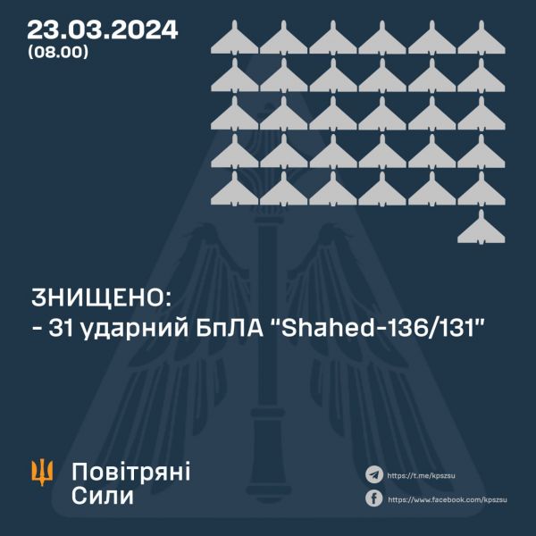 У ніч на 23 березня ЗСУ збили 31 із 34 атакуючих Україну "Шахедів", які запустила РФ з Курської області та мису Чауда в Криму.