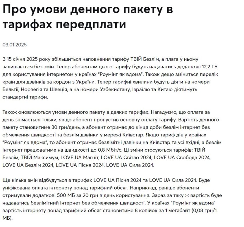 Київ 24 пише, що У компанії розповіли, що будуть застосовувати додаткову плату для денних тарифів, лише якщо абонент пропустив основну оплату тарифного плану.