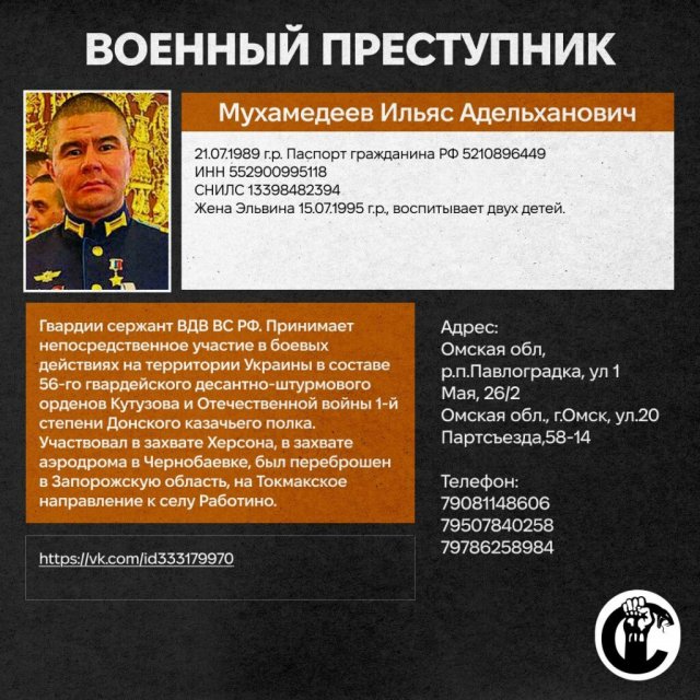 OSINT-секція групи «Інформаційний Спротив» представляє чергового російського воєнного злочинця.Мухамедєєв Ільяс Адельханович, 21.07.1989 р.н. Паспорт громадянина рф 5210896449.