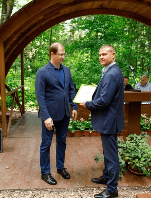 Фото зі сторінки Fb – Нацпарк “Кам’янська Січ”: міністр Руслан Стрілець вручає подяку від Міністерства захисту довкілля та природних ресурсів України Артему Кузьменко. Липень 2023 року.На роботі тепер постали тепер нові завдання. Частина території Національного природного парку «Кам’янська Січ» стоїть замінованою. У наслідок теракту російськими військовими Каховської ГЕС катастрофічно обміліло водосховище. Систематично Артем разом з іншими працівниками парку, пройшовши курси з мінної безпеки, слідкує за тим, що відбувається на цій території, гасить пожежі, продовжують боротьбу з браконьєрами та лісорубами.