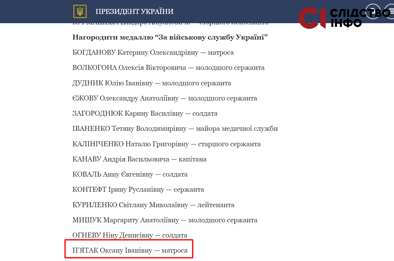 Скриншот наказу про нагородження Оксани П’ятак«Ми ж її хотіли першою звідти витягти. Їй було сказано, щоб вона висувалась на точку евакуації. На що вона відповіла відмовою, і сказала, що вийде останньою», — розповідає Олександр.