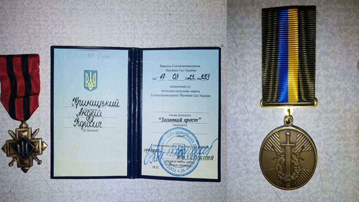 Нагороди Андрія: почесний нагрудний знак Золотий хрест і медаль за участь в АТО.