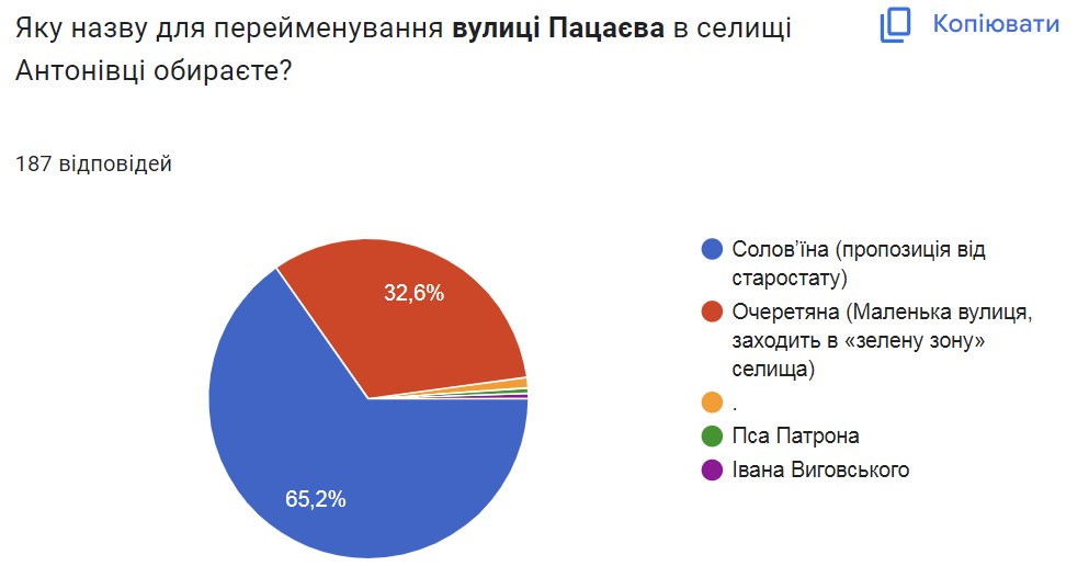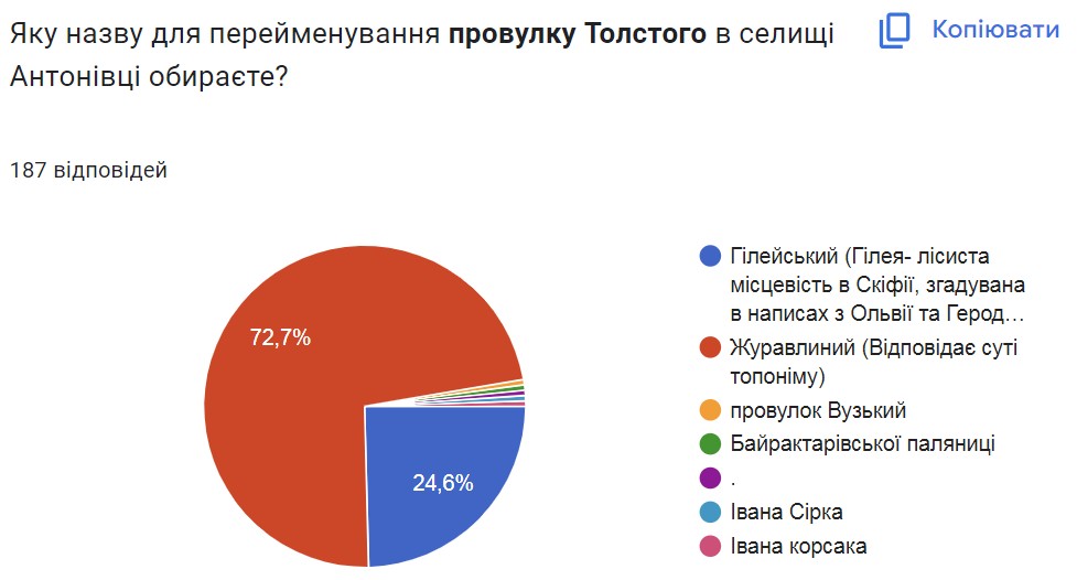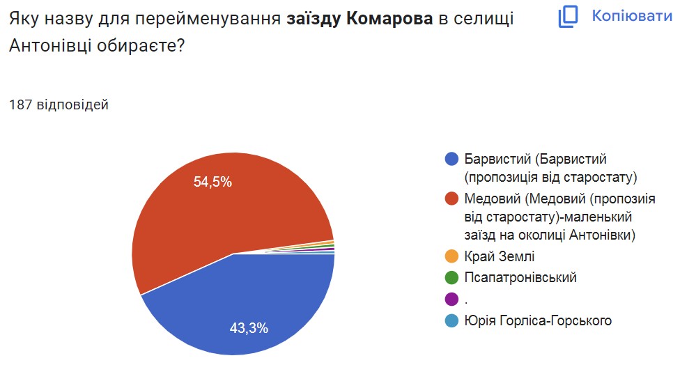 Згідно з проміжними результатами голосування – за участі 187 людей – жителі громади найчастіше обирають запропоновані комісією нові назви вулиць. Але в деяких випадках пропонують і свої варіанти.