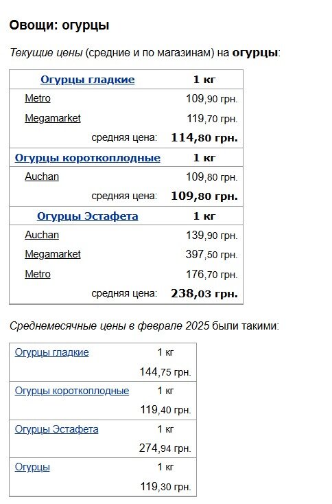 Ціни на гладкі огірки знизилися з лютневих 144,75 грн/кг до 114,80 грн/кг у березні. Короткоплідні огірки також подешевшали із 119,40 грн/кг до 109,80 грн/кг. Однак огірки сорту "Естафета" показали зниження лише на 13,4% – з 274,94 грн/кг до 238,03 грн/кг.