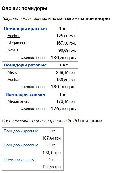 Ситуація з помідорами протилежна – червоні помідори подорожчали зі 107,64 грн/кг у лютому до 130,40 грн/кг у березні. Рожеві помідори зросли у ціні з 160,11 грн/кг до 189,30 грн/кг. А ось помідори сорту "вершка" подешевшали із 122,99 грн/кг до 176,10 грн/кг.