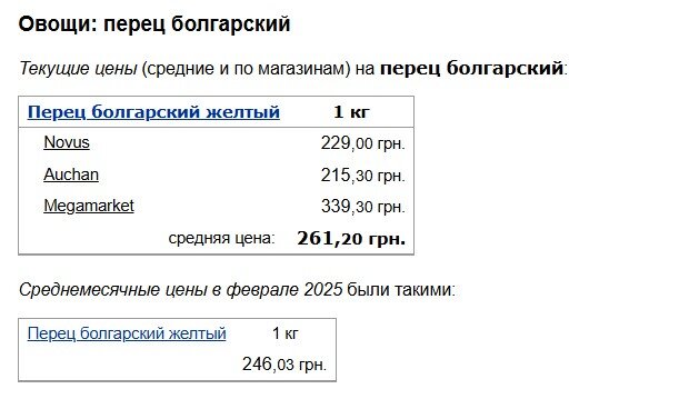 Жовтий болгарський перець показав зростання з 246,03 грн/кг у лютому до 261,20 грн/кг у березні. При цьому якщо в Ашані його ще можна придбати за 215 грн/кг, то в МегаМаркет доведеться віддати 339,30 грн/кг.