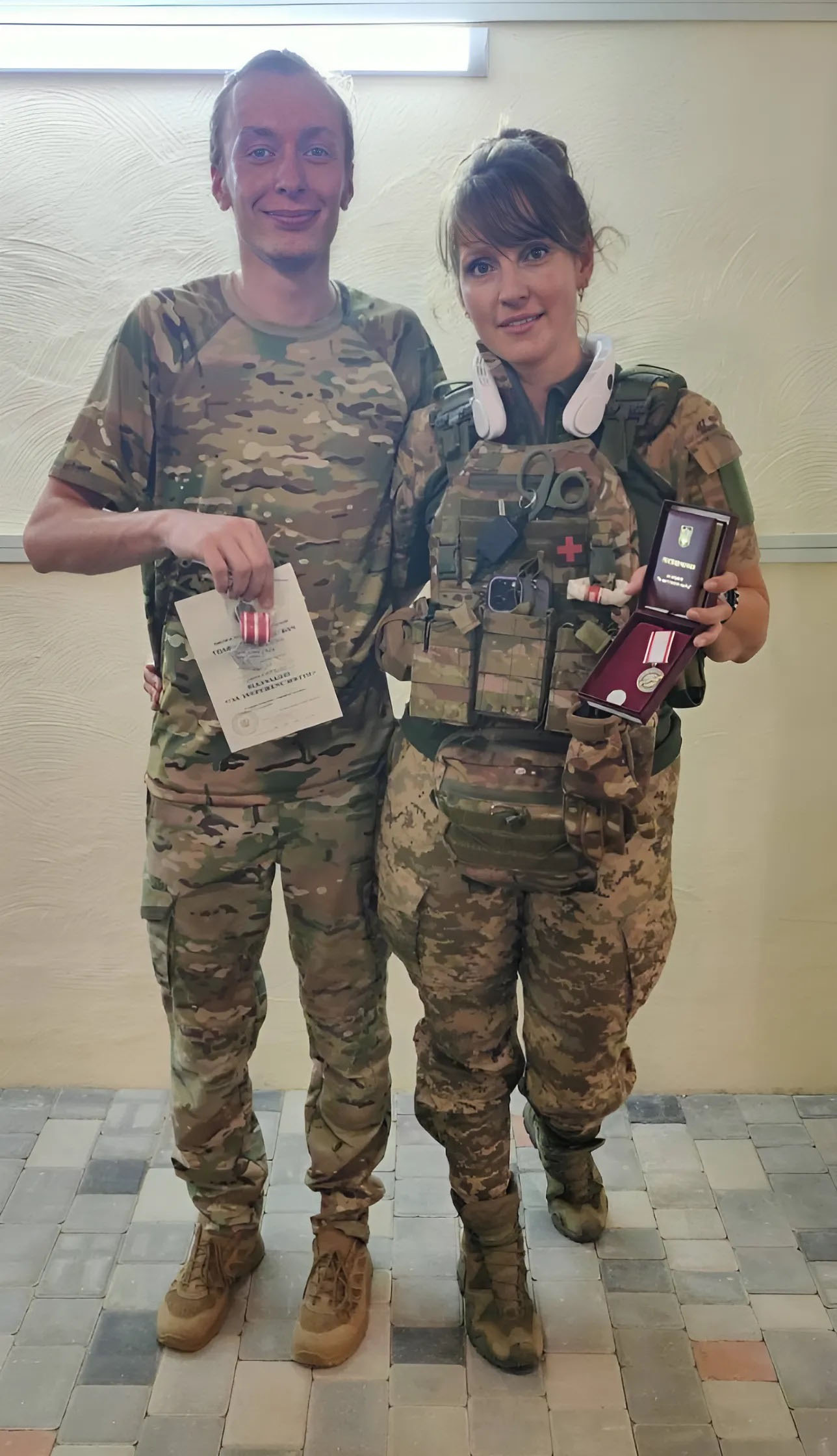 З нагородами: медаллю “За врятоване життя” та нагрудним знаком “Золотий хрест”. На фото Ольга зі своїм бойовим побратимом