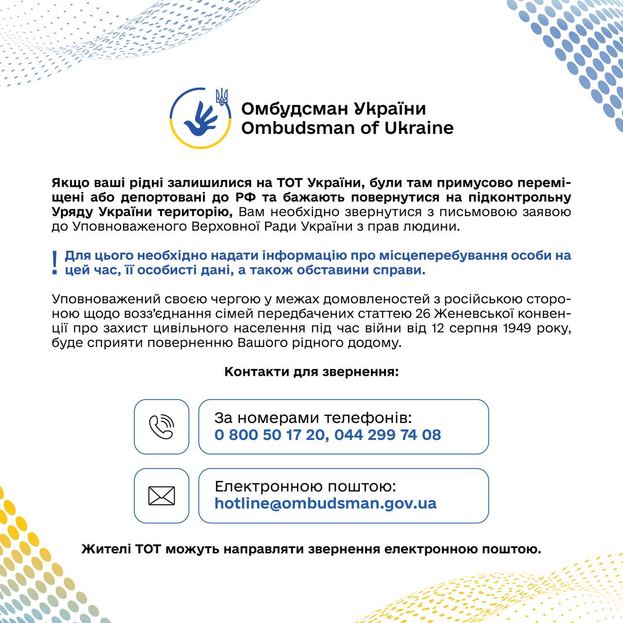 Якщо ваші рідні залишилися на тимчасово окупованій території України, були там примусово переміщені або депортовані до Росії та бажають повернутися на підконтрольну Україні територію, вам необхідно звернутися з письмовою заявою до Уповноваженого Верховної Ради України з прав людини. Для цього потрібно надати інформацію про місцеперебування особи на цей час, її особисті дані, а також обставини справи. Уповноважений у межах домовленостей з російською стороною щодо возз’єднання сімей, передбачених ст. 26 Женевської конвенції про захист цивільного населення під час війни від 12 серпня 1949 року, сприятиме повернення вашого родича додому. Контакти для звернення: – 0 800 50 17 20, – 044 299 74 08, ел. скринька: [email protected]. Жителі ТОТ можуть направляти звернення електронною поштою. Новий День