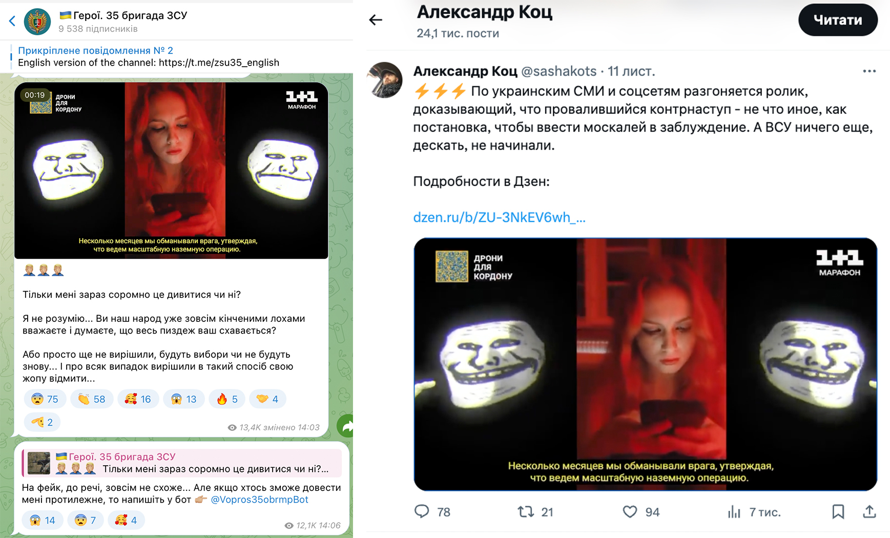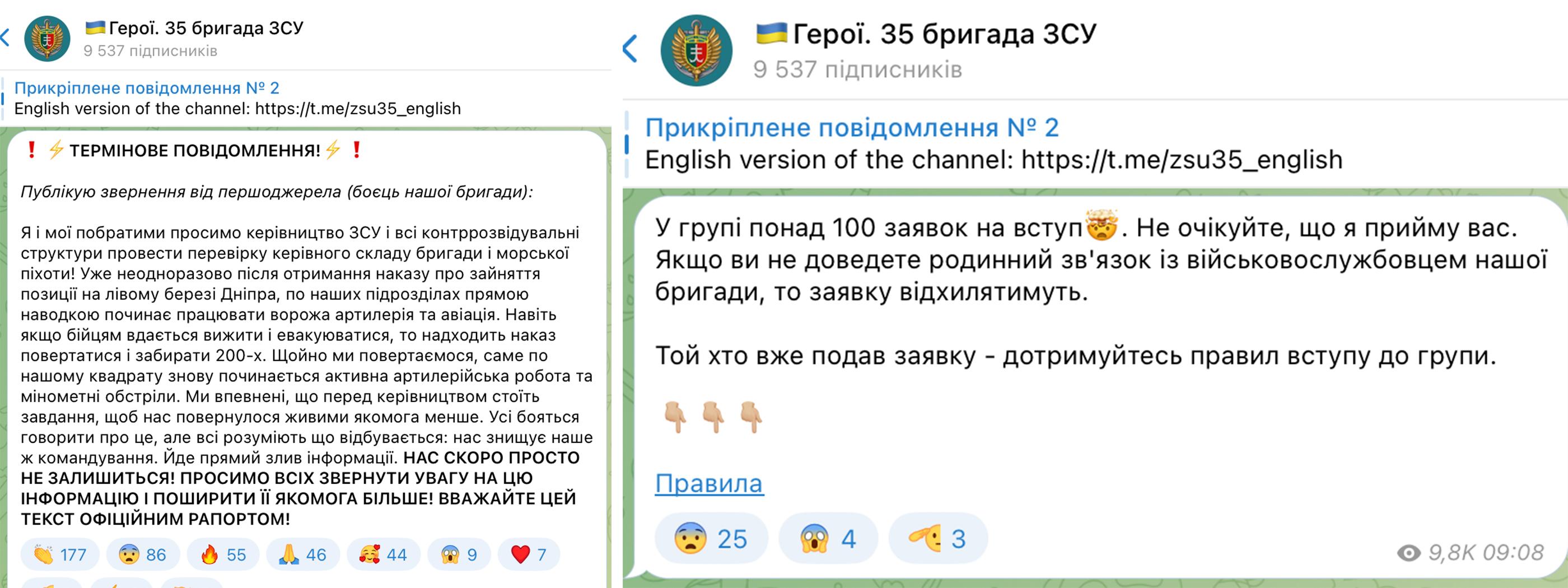 У телеграмі є канал під назвою “Герої.35 бригада ЗСУ”. Там автор розповідає про нібито “реалії української армії на прикладі рідної 35 окремої бригади морської піхоти ЗСУ”. Він пише, що робить це не для того, щоб “розповідати” патріотичні балачки про те, як вони вчотирьох повалили колону росіян, бо “наші роблять усе, щоб зупинити просування РФ всередину нашої території, але не дуже успішно”.Розповідає й про те, що психологія українського солдата тримається на благородних мотивах любові до Батьківщини та готовності захищати свою землю, але, “цього зовсім недостатньо в умовах сильного емоціонального тиску”. Автор пише, що загибель третини його побратимів викликала відмову виконувати накази (бо він не може нікого засуджувати за відмову воювати – психіка у всіх різна), але деякі з гідністю витримали цей удар. Головне, додає він, щоб влада та народ розуміли та пам’ятали це.