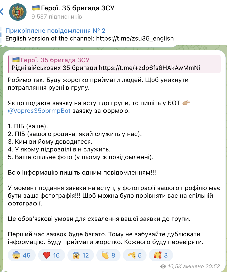 Так, цей канал – ворожий, який до того ж збирає дані українців, чиї родичі воюють у складі 35 бригади ЗСУ. Медіаплатформа “Вгору” розбирається, як це усе працює.