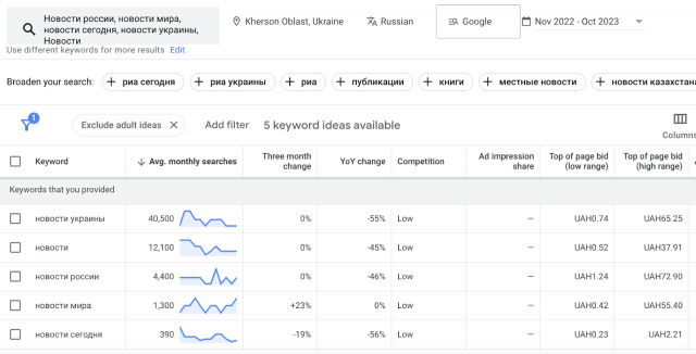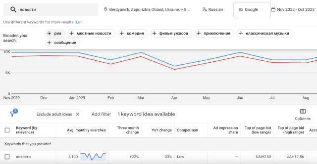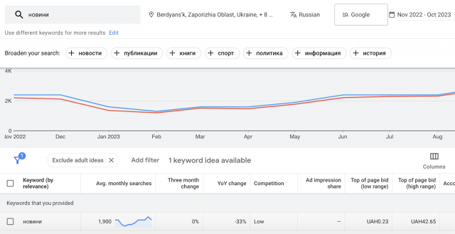Які ж справи з пошуком російською мовою в Google на українських територіях окупованих росіянами під час повномасштабної війни? Як бачимо з графіка нижче, щомісяця на Херсонщині є близько 60 тисяч пошуків новин, за даними Планувальника ключових слів Google.