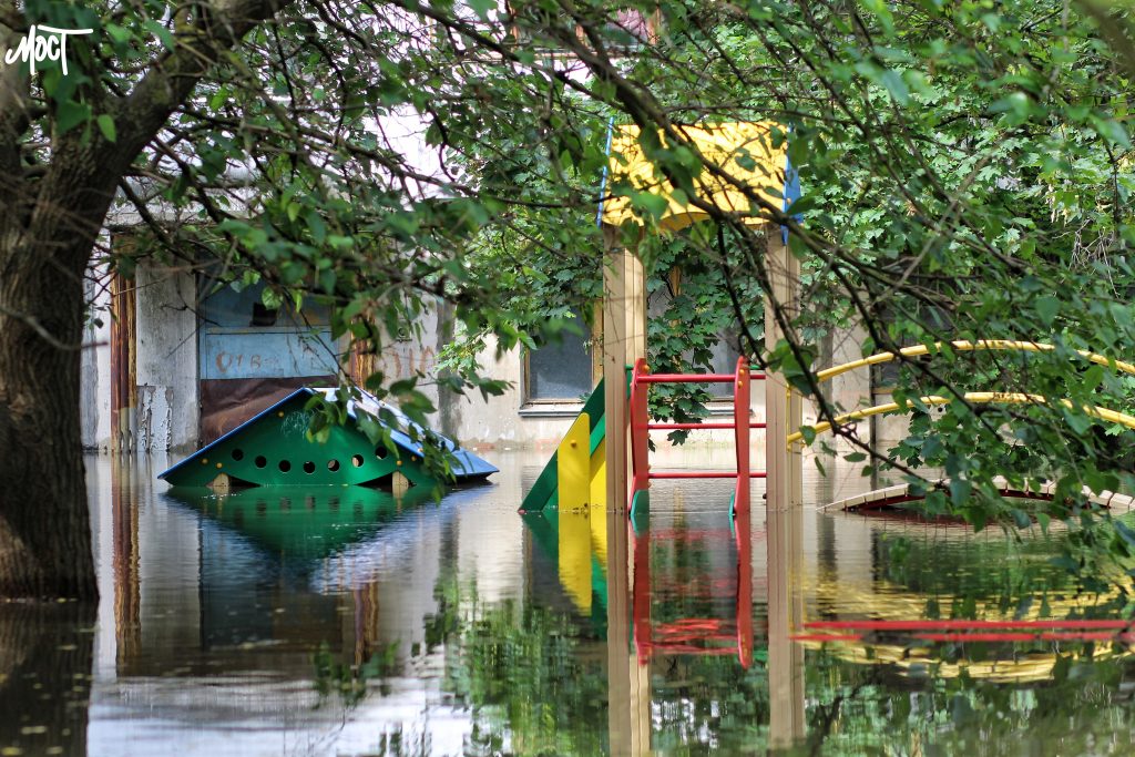 Червень та липень 2023 року, пункт евакуації після затоплення та це ж місце після сходження води