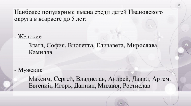 Зокрема, аналізом імен юних іванівців. «Ми провели аналіз, у результаті якого визначили як найпопулярніші, так і рідкісні жіночі і чоловічі імена серед дітей, які народились у період з 2020 по 2024 роки, а також з 2012 по 2020 роки, -написали пропагандисти у Телеграм. - В останнє десятиліття спостерігається повернення до старих слов’янських імен, таких як Свєтозар, Мирослав, Дана, Лада, а також імен іноземного походження, популярних у наших предків -Уляна, Праскова, Гліб, Єгор». Серед рідкісних імен дівчаток з окупованого «округу» зустрічаємо, наприклад, Іветту, Ельзару та Домініку, хлопчиків - Тараса, Марка і Матвія. Чи називали так тих, хто народився вже в окупації, не повідомляється. Як не повідомляється і про те, чи взагалі народжуються зараз в Іванівці діти.