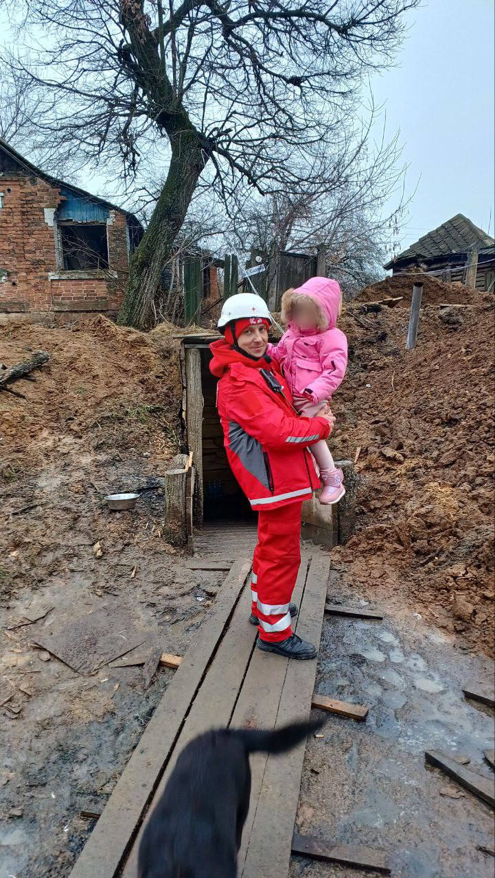 Волонтер Віталій Кулик. Фото зроблене на кордоні – у Покровці на Сумщині. Дівчинці Маші 2 рочки – їй та її вагітній мамі Віталій Кулик допомагав подолати двокілометровий піший перехід «сірою зоною». Вони прибули з окупованої території Херсонської області