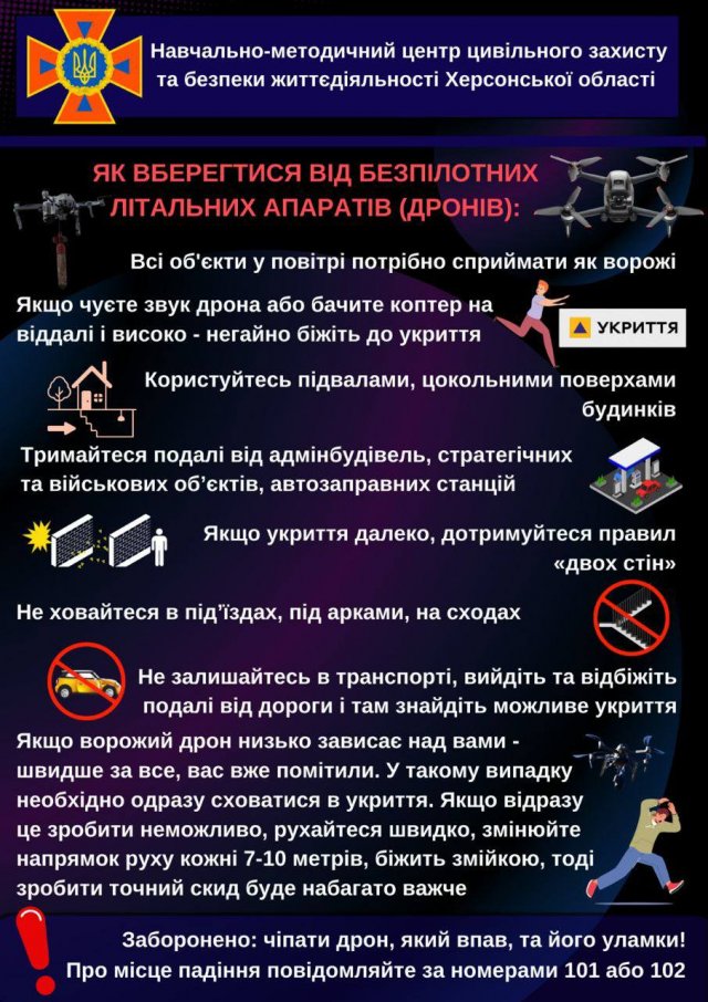 - Якщо чуєте звук дрона або бачите коптер на віддалі й високо — негайно біжіть до укриття.