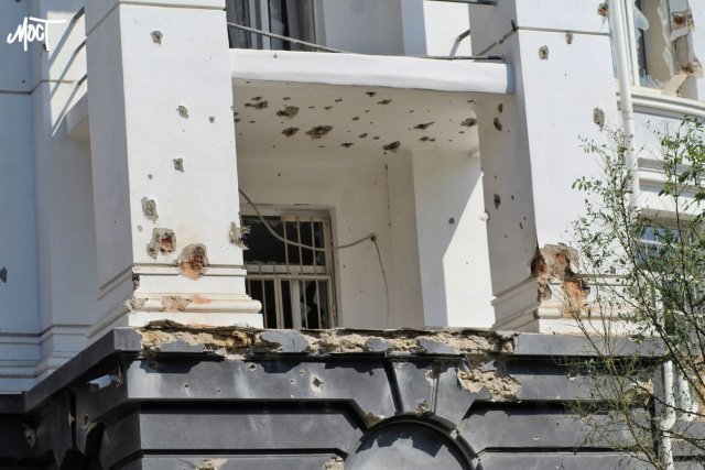 На фотографії видно, що на будівлі академії сліди від уламків, також видно, що повилітало скло у вікнах.