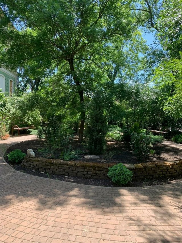Та ось і диво: зелена квітуча оаза, така сама, якою була до повномасштабного вторгнення. Ота пригімназійна ділянка, улюблене місце відпочинку дітей і дорослих, залишилася неушкодженою і такою ж доглянутою, як і в мирні часи! Погляньмо на фігурні клумби з різнобарвними квітками, ландшафтними рослинами, гармонією яких ми захоплювалися! Ковані лавки, які немов очікують на повернення юних пустунів з їх безтурботним сміхом і гумором. Дбайливо підметені мощені доріжки, що мріють про тупіт дитячих ніжок… Тіниста зелень бузку, що немов розділяє два світи – вічну красу природи та грізну стихію ненависті, що спотворила нашу другу домівку.