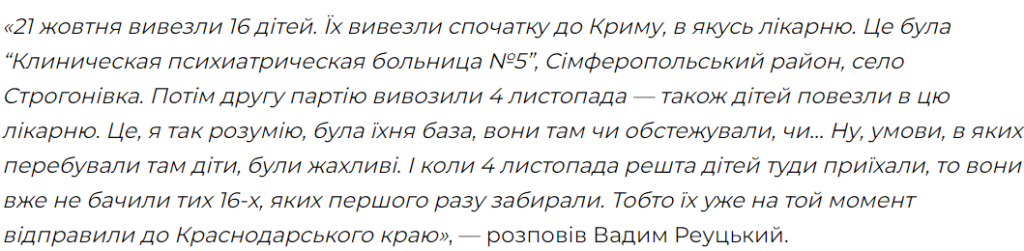 За словами Реуцького, друга група дітей не зустріла першу, припускаємо, що перших дітей далі відправили до Краснодару. Адже там опинився один із вихованців Олешківського інтернату Микита Біланчук, про історію його порятунку можна прочитати у матеріалі видання hromadske.