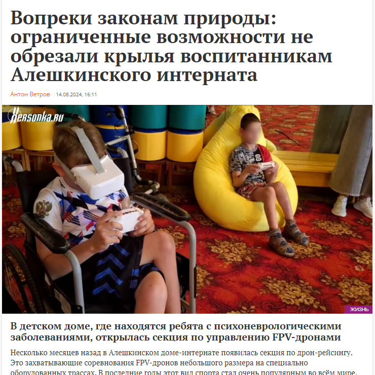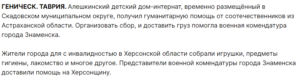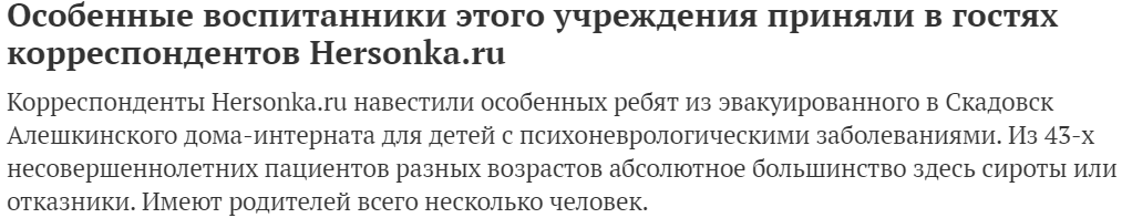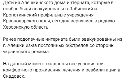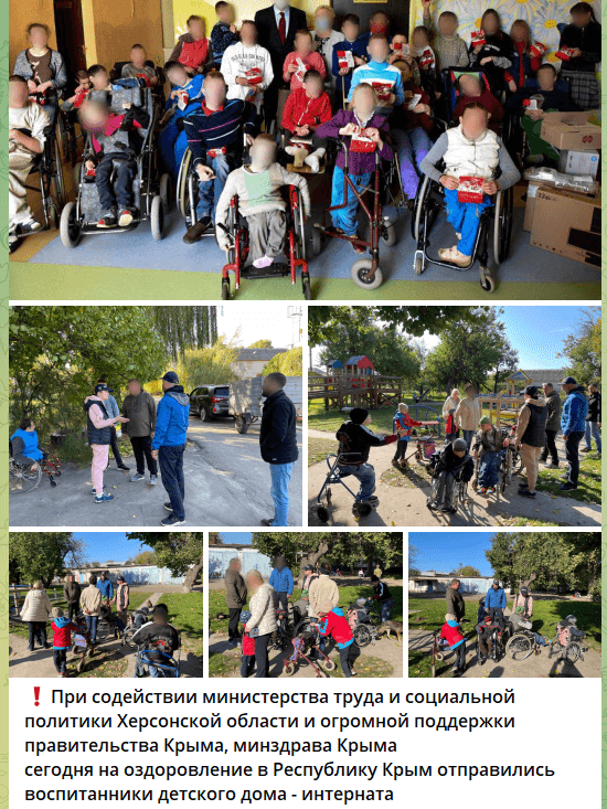 Під виглядом оздоровлення окупаційна влада Херсонської області у 2022 році вивезла 105 вихованців Олешківського інтернату до психлікарні у Сімферопольському районі, далі — у Росію. У 2023 році частину вихованців повернули до релокованого інтернату в Скадовську, де дітей нині вчать…пілотуванню FPV.
