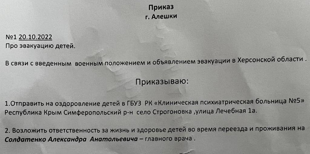 Осінтери ЦГЦ Фонду Притули знайшли у мережі фото наказу колаборантів зі списком дітей. Відправляли 12 осіб із Олешківського інтернату до психіатричної лікарні № 5 в окупованому Сімферопольському районі. Вік дітей — від 9 до 17 років.