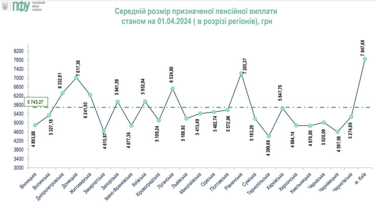 За даними ПФУ, найбільшу пенсію отримують у Києві (7 тисяч 847 гривень 68 копійок), а також у Рівненській (7 тисяч 205 гривень 37 копійок) та Донецькій (7 тисяч 17 гривень 36 копійок) областях.