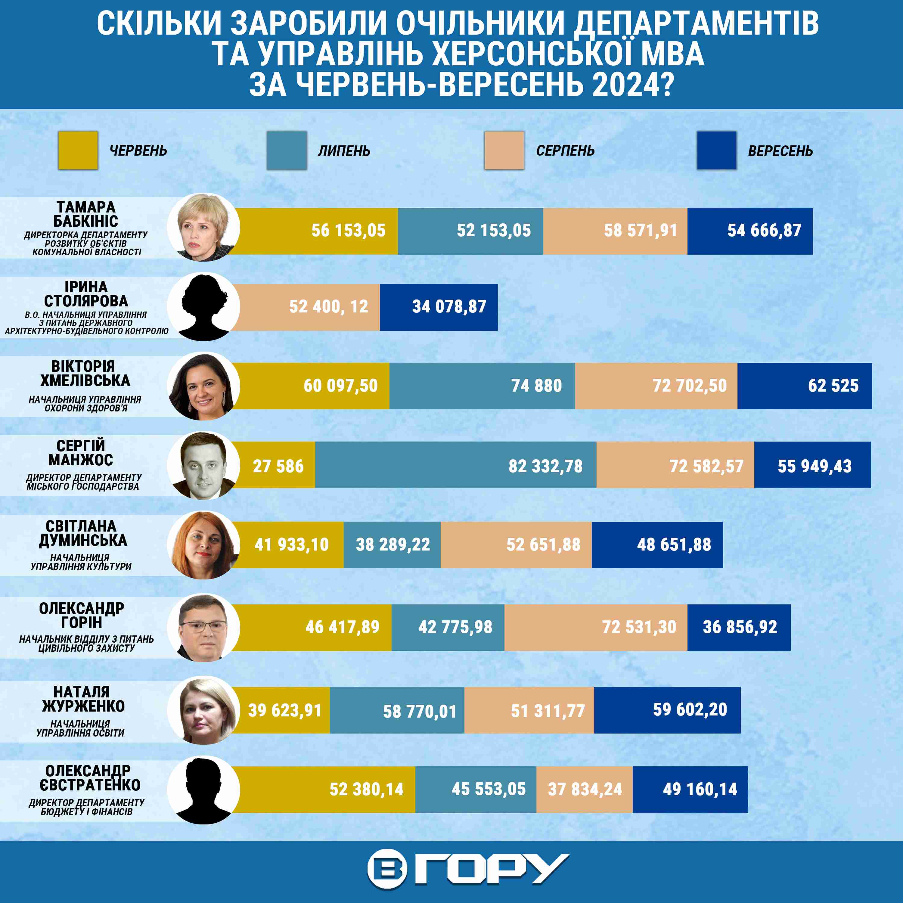 Очільникам 8 управлінь та департаментів Херсонської міської військової адміністрації з червня до вересня 2024 року нарахували 1 мільйон 538 тисяч 342 гривні 73 копійки заробітної плати.