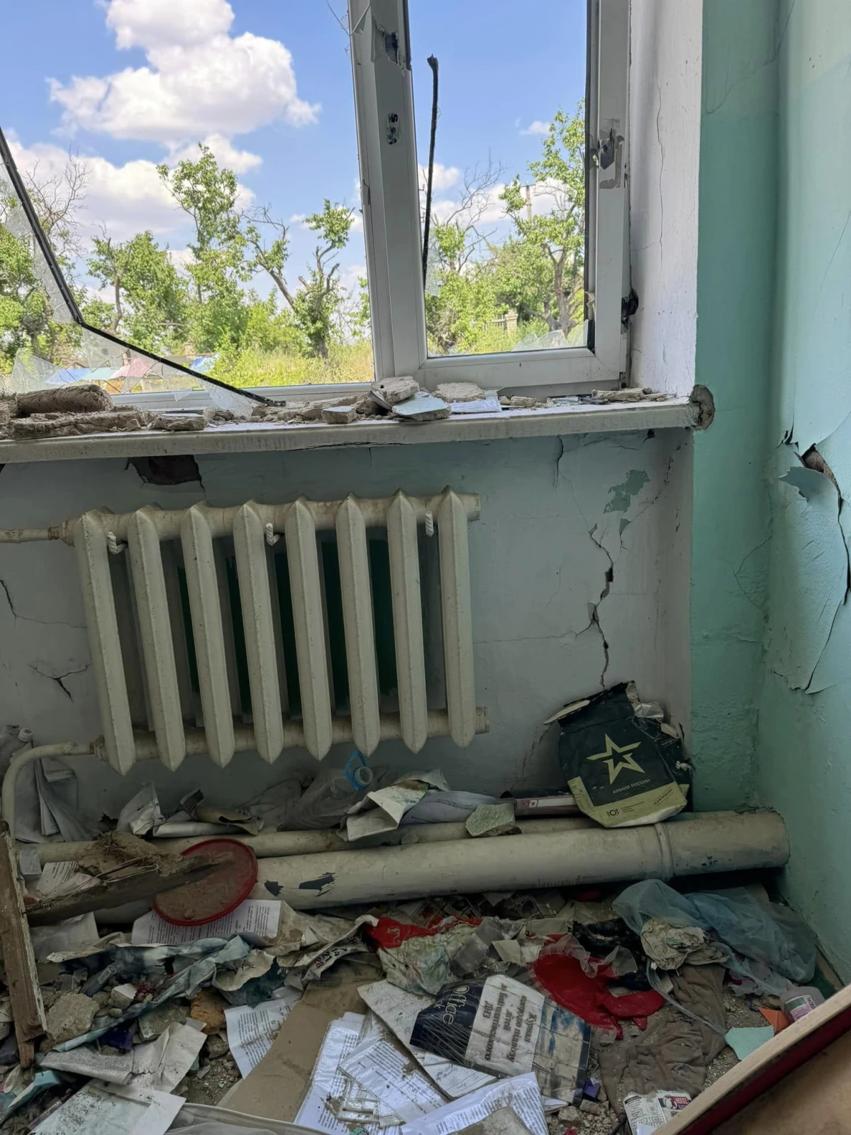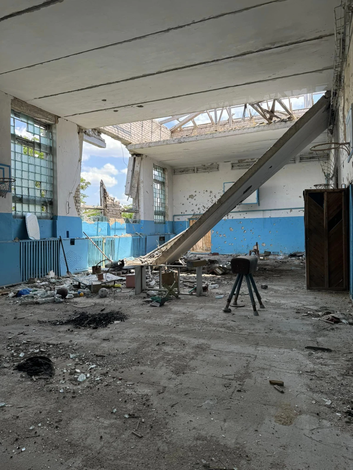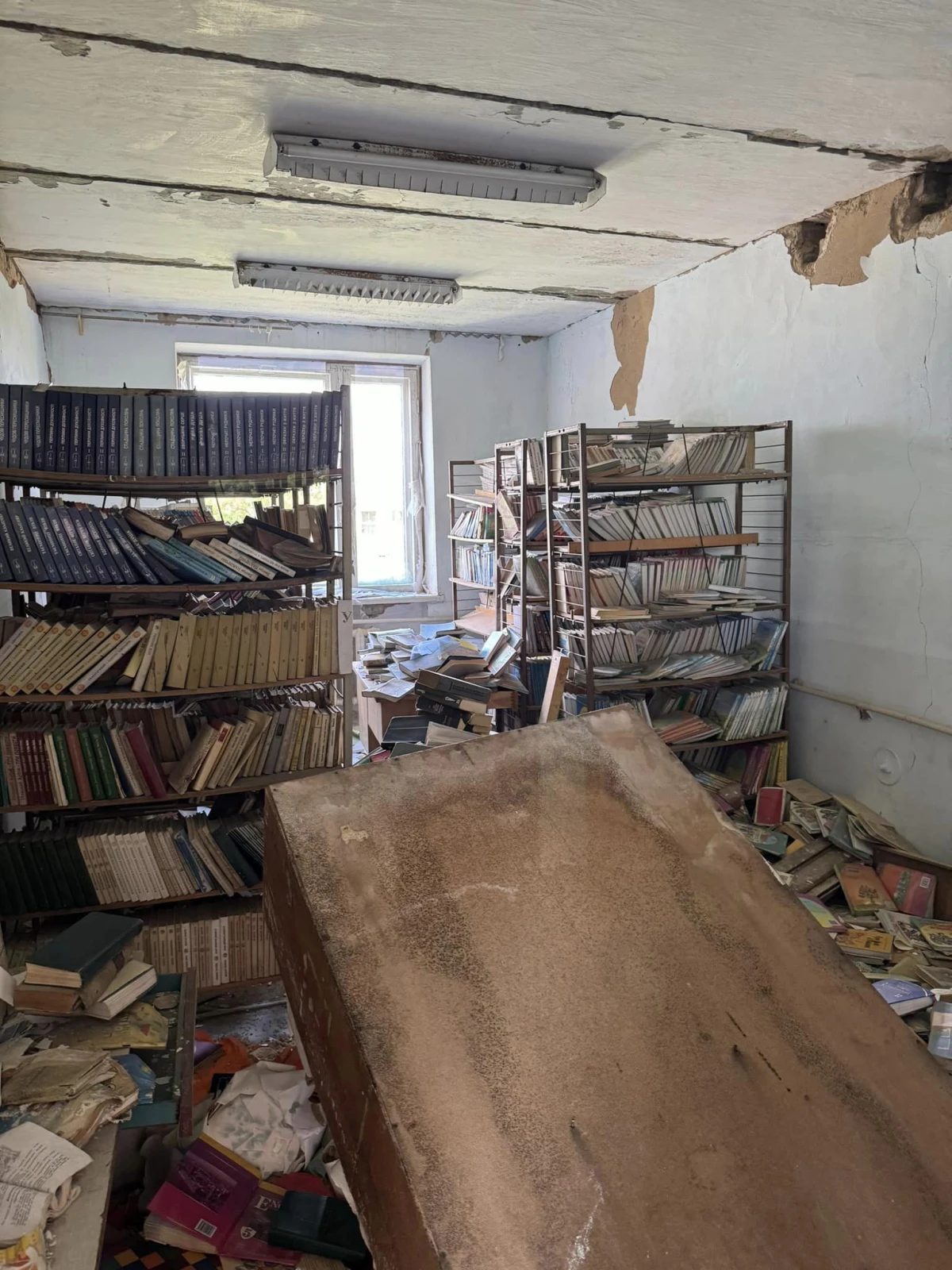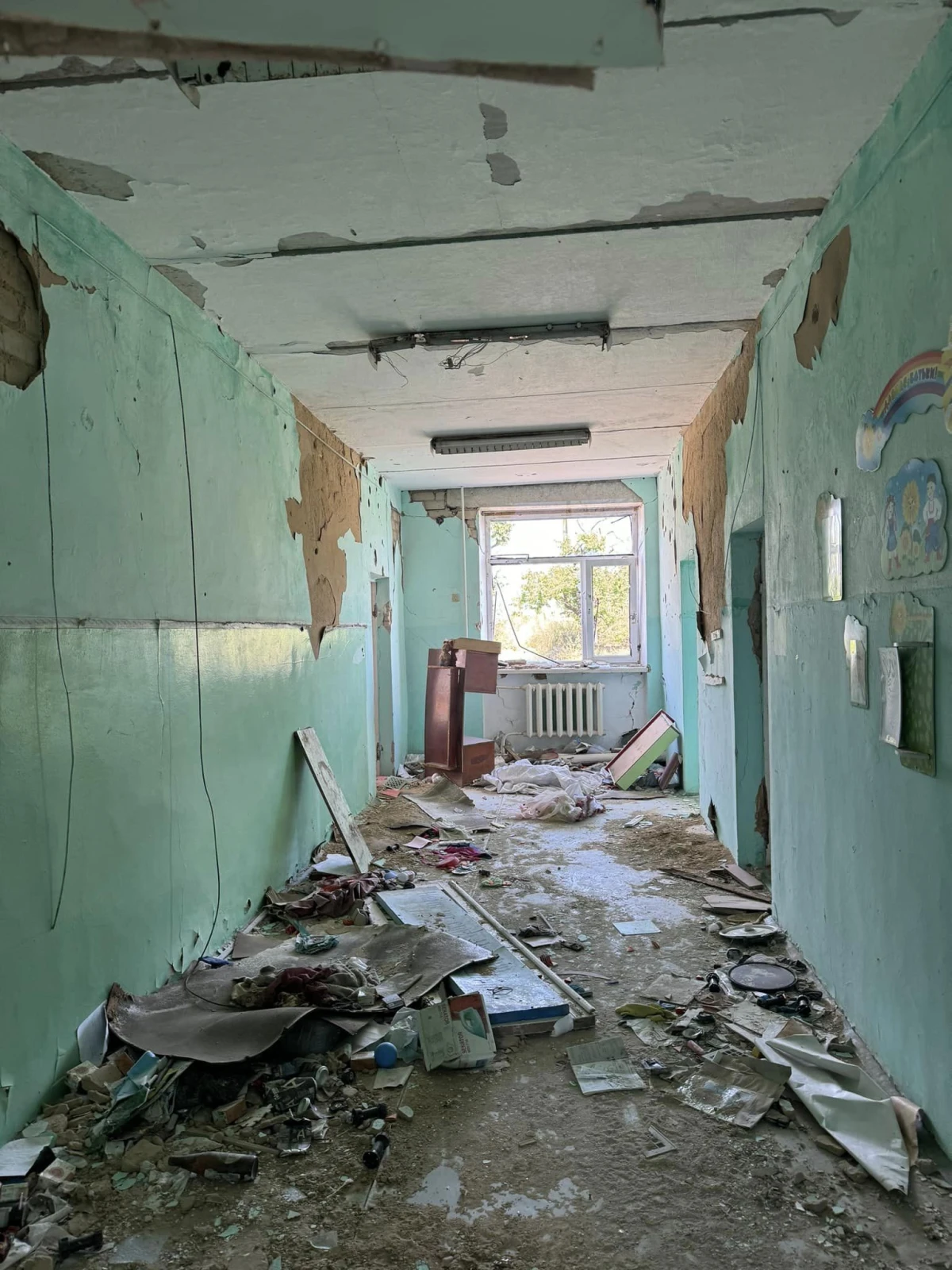 На фото видно, що в одному місці повністю зруйновано два поверхи. Окрім цього, немає вікон, провалилася стеля та пошкоджені стіни.